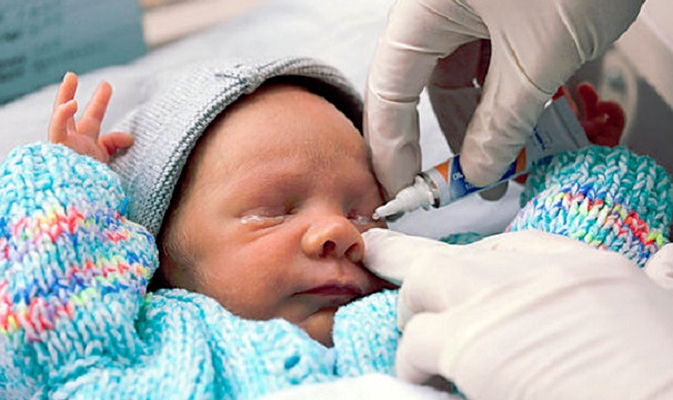 Some hospitals routinely offer babies to have eye ointment within one hour after birth. The eye goop is actually an antibiotic treatment such as erythromycin, tetracycline or silver nitrate. The idea is to cleanse the eyes to prevent any infection usually associated with sexually transmitted disease (STD). Some states require you to give it by law, please research what